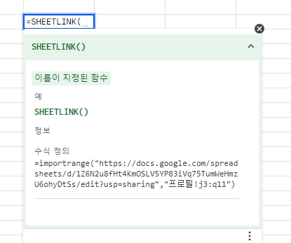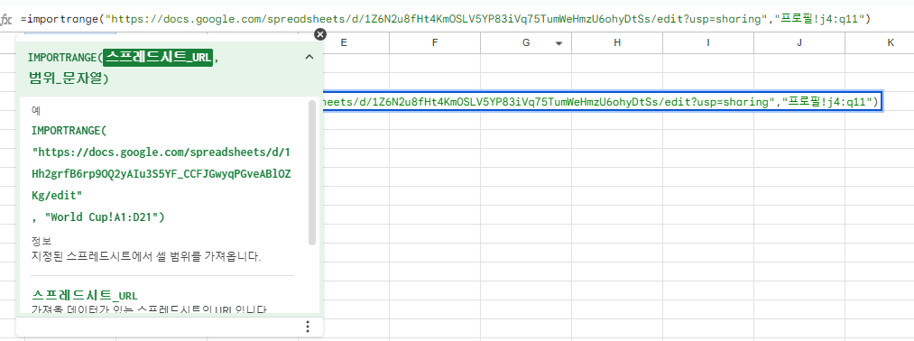 원래 importrange 함수는 "시트 링크", "불러올 범위"가 필요했었죠?