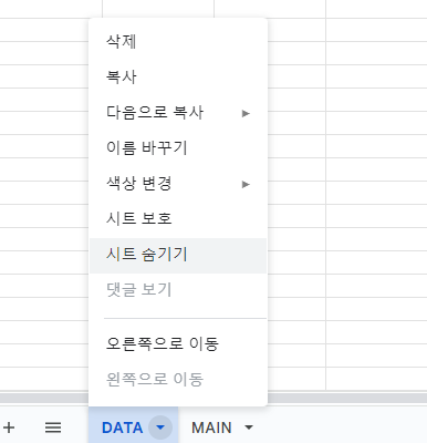 그리고 DATA 탭을 숨기기 처리합니다.