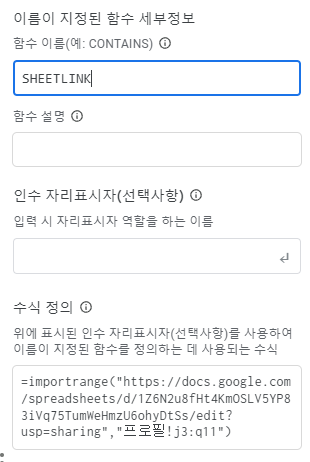 함수 이름에 원하는대로 적으시고, 수식 정의에 importrange 어쩌고를 전부 다 넣습니다.
