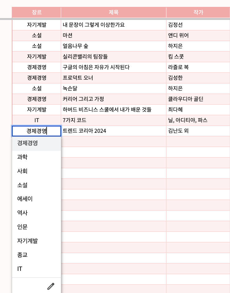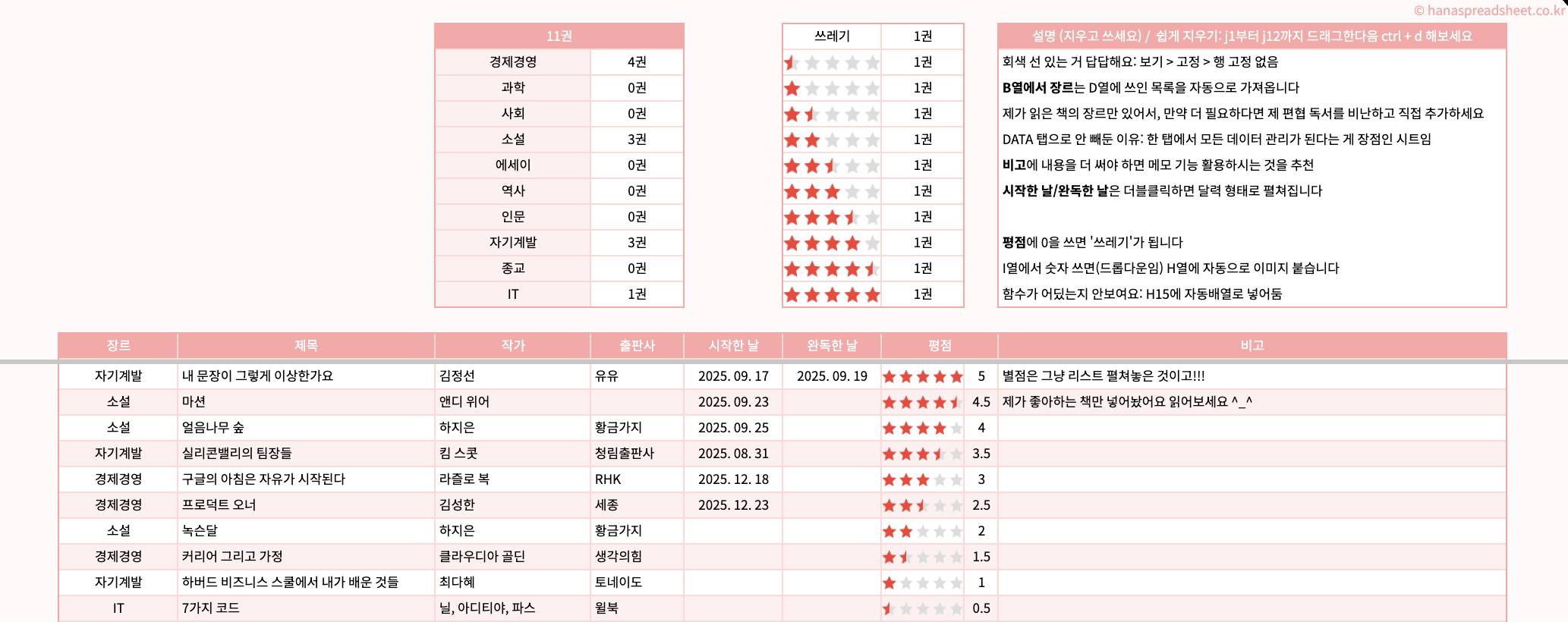 1. 간단하게 쓸 수 있는 스프레드시트입니다. 말 그대로 독서기록장입니다.