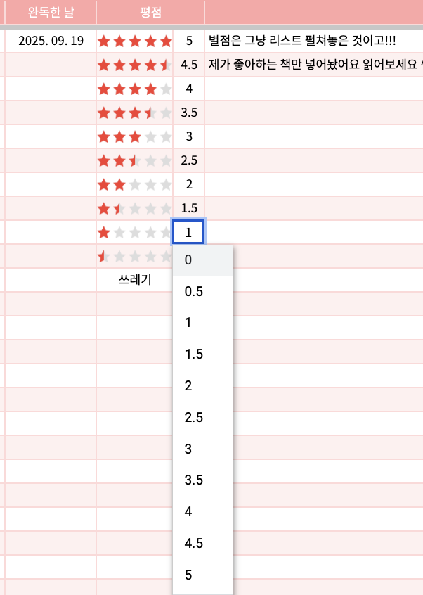 별점 입력하는 독서 기록장 시트