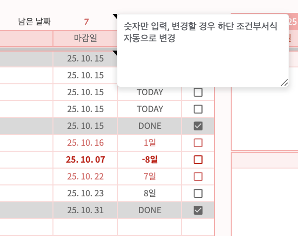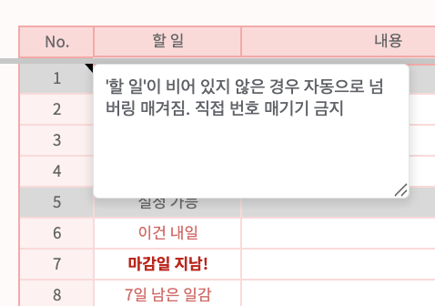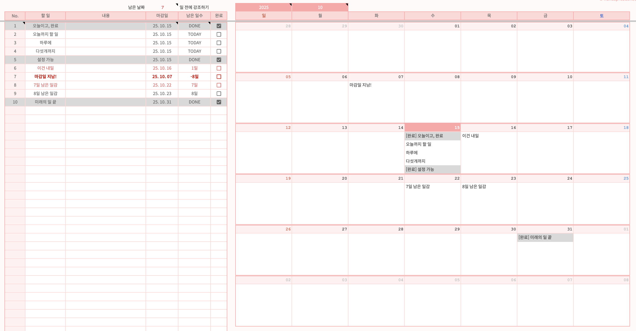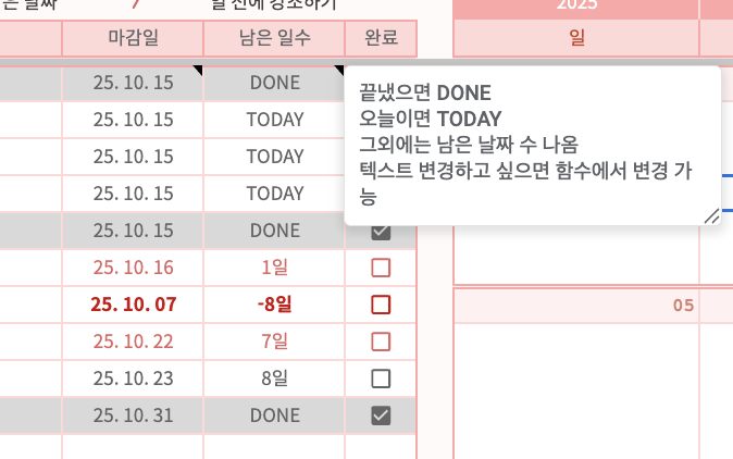 1. 좌측 리스트에 마감일과 할 일을 작성하면 우측 달력에 자동으로 가서 붙는 시트로, 해당 시트의 간략화 + 코드 효율화 버전입니다.